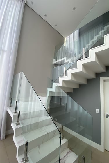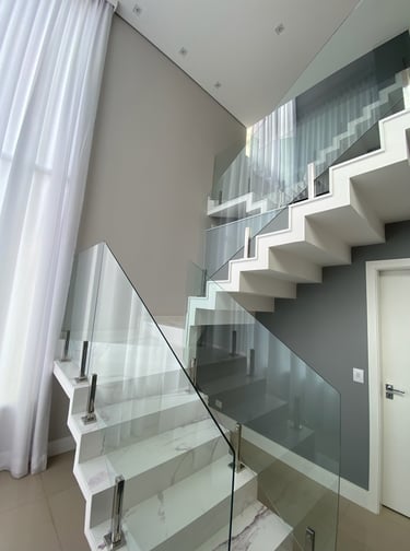 Segurança com design sofisticado. Produzimos guarda-corpos em vidro para escadas, varandas e áreas externas, unindo resistência e elegância.